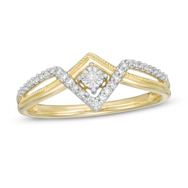 Crafted in warm 10K gold, this headpiece features a diamond border and pavé-detailed ribbon, carved into a subtle double “V” design. At the center of this split-prong setting is a petite diamond – strategically placed to enhance dimension and sparkle. With a 1/10 carat diamond and a brilliant polished shine, this ring is an accessory you’ll wear often.